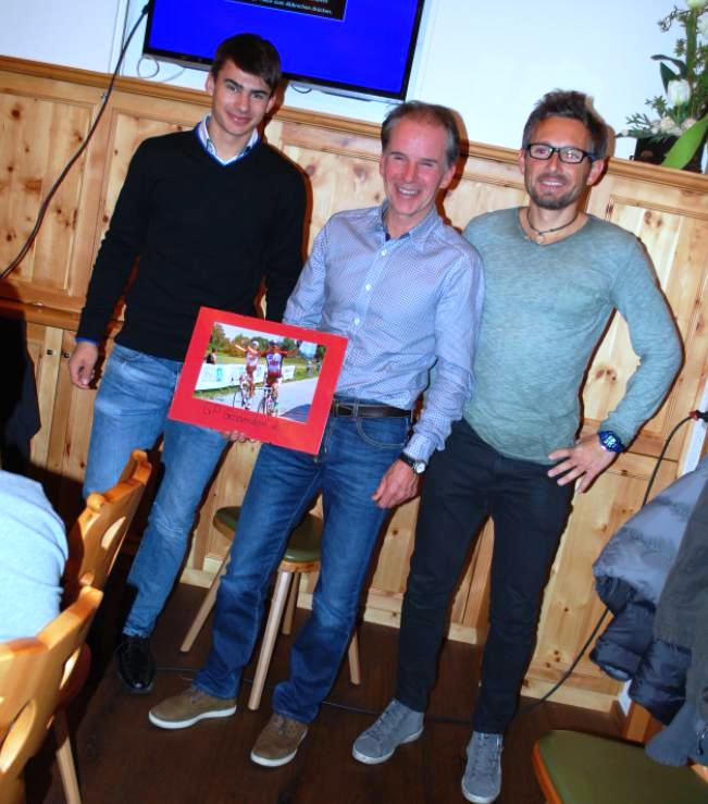 Besonderes Highlight der Feier: Der umtriebige Obmann Gerald Nathan bekommt von den 2 ARBÖ Trieben-Top-Fahrern Thomas Rettenegger und Moritz Irendorfer ein gerahmtes Bild vom Doppelsieg beim Rundstreckenrennen in Gössendorf.