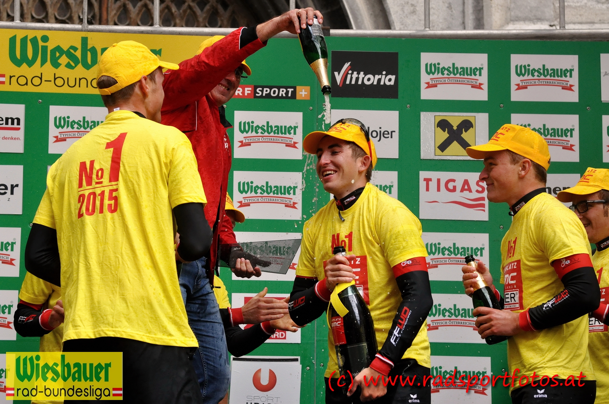 So wie die Amplatz-Truppe die Saison über aufgetreten war, so hat sie dann auch die Siegerehrung beim Liga-Finale in Schwaz zelebriert, nämlich ordentlich vorbereitet: leuchtendgelbe Kapperln für Fahrer und Betreuer, dazu gleichfarbige T-Shirts, die vom begehrten Gesamtsieg in der Wiesbauer-Radliga künden. Und weil Erich Amplatz Nägel mit Köpfen macht, durfte Andi Bajc auf dem Siegespodest auch echten Champagner verspritzen.